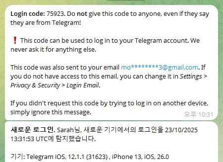 - PC 텔레그램에서 Telegram 그룹으로부터 Login Code 가 발송되는데 해당 로그인 코드 를 입력하시면 메일 인증 없이 모바일에서 로그인이 가능합니다.